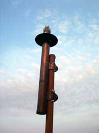 Pictured above are reproduction signal torches used by the 1st Section, US Signal Corps, Dept. of N.Y. Civil War reenactors. And are shown here as referance to their design and "look". The left picture is the foot torch, used as a reference point. The picture on the right, being attached to the staff, was used for sending the signals. Upon orders in May of 1861, Myer was sent back East, where his system would first be used in combat. The equipment commonly used in Myer's visual system consisted of flags for daytime and torches burning turpentine at night (see signal equipment). There was a red, a white, and a black flag, with a white center in both the red and black flags and a red center in the white flag. With green, dark, or any earth-colored back grounds, the white flag was be used. With a sky exposure, the black flag was to be used. With broken, or mixed back grounds, the red flag was be used. The red flag, or signal, is that to be generally used at sea, as on vessels where, in part of its motion, the flag exposes against the wood work, or rigging, or sails, of the vessel; and in part against the sky or water. It is well also to use the red flag when snow may form part of the background. For general uses, the white flag, or signal, was found to be best, and was used in nine instances out of ten. The staffs, to which the flags were attached, were made of hickory with four tapering joints fitted together by brass ferrules. The joint having a six-inch brass guard at its upper end to protect it from the flames of the flying torch, which was attached to this joint for night signaling. A foot torch served at night as a point of reference. These messages were read from great distances by the use of a glass (telescope).[5]