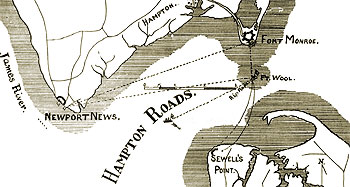 Myer reported for duty at Fortress Monroe in June of 1861. He failed in an effort to obtain Cushing's services, but Commanding General Ben Butler ordered details of men for signal duty and Myer proceeded to instruct them. Immediate results were the opening, in late june of 1861, of a signal line connecting Monroe and Newport News, as well as, the directing, by signal, of an Artillery battery on the Rip Raps.[7] This direction of gunfire would be a common service provided by the Signal Corps throughout the war.